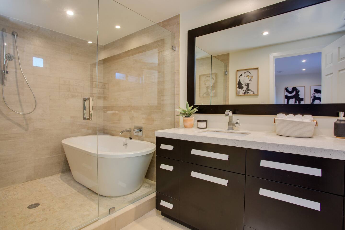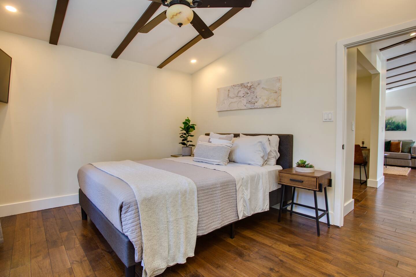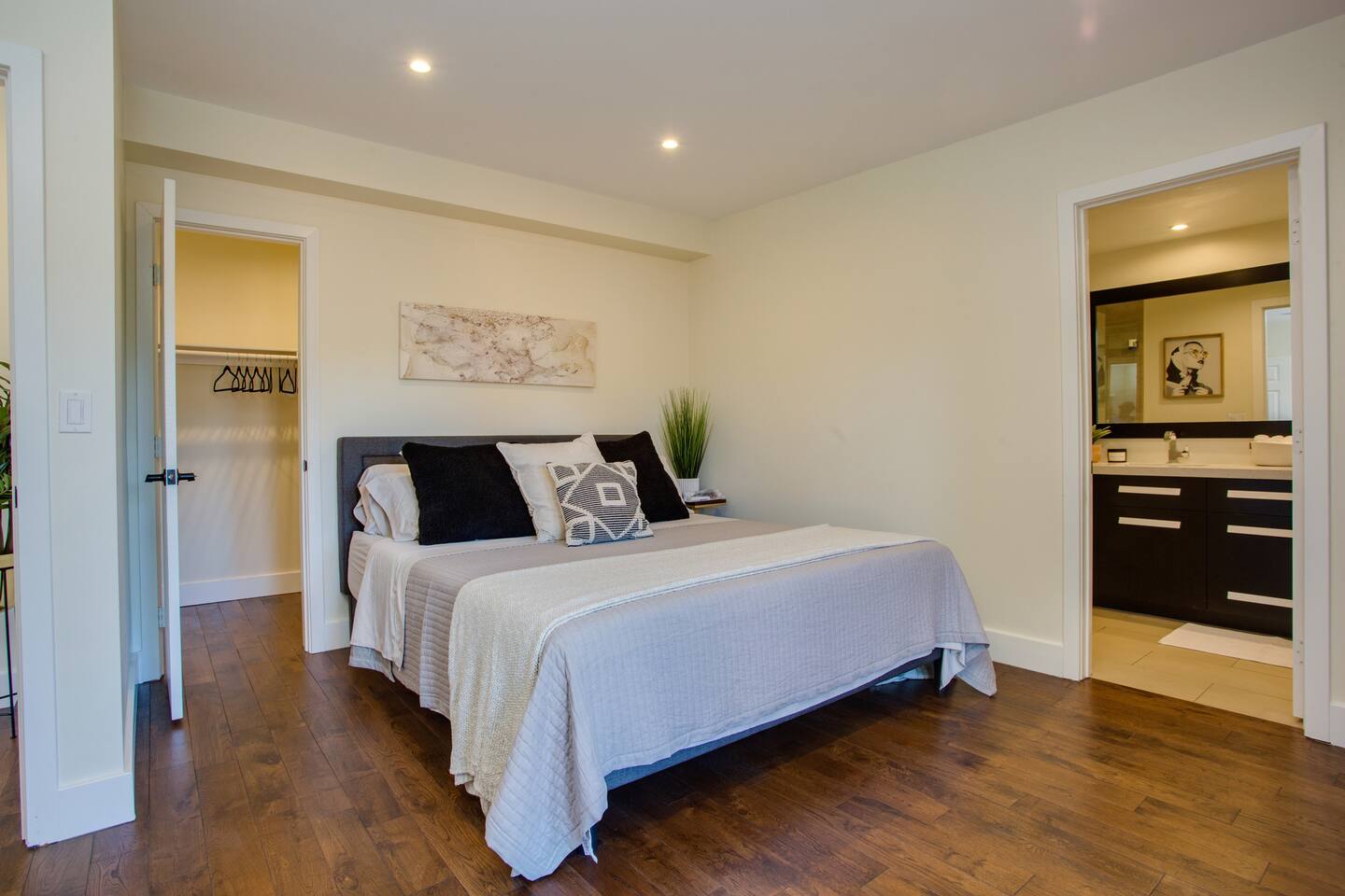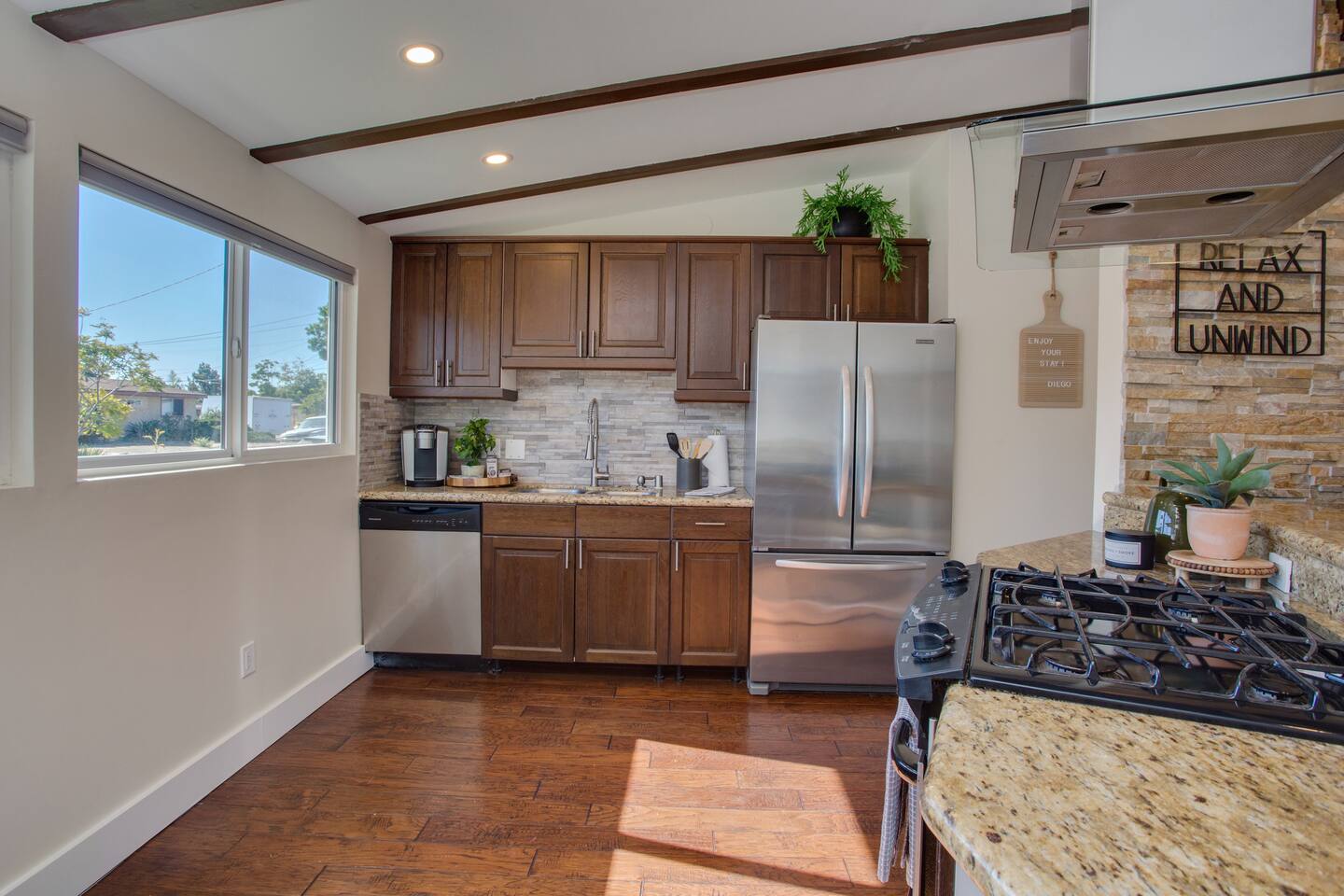 THIS HOME IS COMPLETELY DIALED IN *Walkthrough video available on YouTube by entering "t-5DyI4Qmd4" on the search bar. FAMILY ROOM / DINNING - 65in 4K TV and SONOS sound system loaded with Cable TV, Netflix, YouTube, Pandora and more - French doors opens up to outdoor living area giving an open layout great for entertainment - Kitchen bar seating with 4 bar stools KITCHEN Modern and open layout with stone counters, white wood cabinetry, brand new stainless kitchen appliances, bar seating. This is a fully stocked kitchen, with everything you need to cook great meals! Comes with: -Plenty of Pots/Pans/Platters -Keurig K-Elite Coffee Maker -Serving utensils -Grilling tongs -Full set of chef knives -Dishwasher, oven, microwave, toaster -Almost any condiment you need! We keep the fridge and pantry stocked with olive oil, butter, salt, pepper, hot sauce, BBQ sauce, mustard, ketchup, mayo, spices etc. LAUNDRY -Top of the line Samsung Large Washer and Dryer -Sunbeam Steam Iron, Laundry Soup, Fabric Softer and Iron Table OUTDOOR AREA -Outdoor Top Deck w/ BBQ, Refrigerator and Grilling Tools -4 person Hot Tub / Jacuzzi / Spa -Fire Pit and lots of seating, perfect for night gatherings BEDROOMS Room 1 - Master w/ Bathroom -King Size bed with premium pressure-relieving memory foam and high-density aerated cool gel, combined to provide the essential support and comfort for a deeper night's sleep = Super Comfortable! -A/C – Split unit system which means you can control the temperature independently in each room - 50in 4K TV loaded with Cable TV App, Netflix, YouTube, Pandora and more - Oak Hardwood flooring, recessed LED dimmable lighting, curtains and beautifully decorated Room 2: -Queen Size bed with premium pressure-relieving memory foam and high-density aerated cool gel, combined to provide the essential support and comfort for a deeper night's sleep = Super Comfortable! - No A/C in this room - 50in 4K TV loaded with Cable TV App, Netflix, YouTube, Pandora and more - Oak Hardwood flooring, recessed LED dimmable lighting, curtains and beautifully decorated Room 3: -Queen Size bed with premium pressure-relieving memory foam and high-density aerated cool gel, combined to provide the essential support and comfort for a deeper night's sleep = Super Comfortable! - No A/C in this room - 50in 4K TV loaded with Cable TV App, Netflix, YouTube, Pandora and more - Oak Hardwood flooring, recessed LED dimmable lighting, curtains and beautifully decorated Room 4: Third bedroom is the overflow spot -or- what we call the "bonus room." The largest in the house, it has a private entrance and is not continuous with the main home, as you have to access it by leaving the backyard door (see pics). If you have any questions about it, please ask first before booking! -King Size bed with premium pressure-relieving memory foam and high-density aerated cool gel, combined to provide the essential support and comfort for a deeper night's sleep = Super Comfortable! -A/C – Split unit system which means you can control the temperature independently in each room - 50in 4K TV loaded with Cable TV App, Netflix, YouTube, Pandora and more - Hardwood flooring, LED dimmable lighting and beautifully decorated LOCATION The house is located in the heart of San Diego. Walk to (within 1 mile): Starbucks, Vons, Outback, Denny's, Jamba Juice, Reading Cinemas and more. Short Drive to: SeaWorld - 8 miles Downtown - 16min drive (11 miles) San Diego Zoo - 15min drive (9.5 miles) SAN Airport - 16min drive (11 miles) Pacific Beach – 6 miles La Jolla - 7 miles